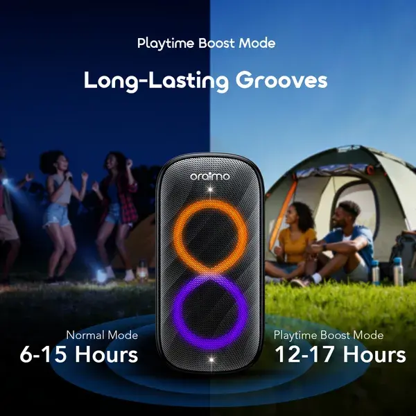 Keep the music flowing for hours with Playtime Boost Mode, perfect for all-day festivals or overnight camping trips. The beat goes on long after the crowd arrives.