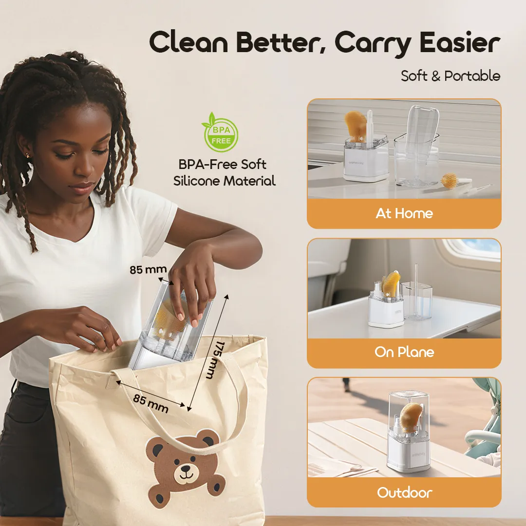 This versatile kit includes a baby bottle and nipple brush for thorough cleaning, a straw brush for narrow spaces, a soap dispenser for easy application, and a travel drying rack to keep everything clean and organized wherever you go.