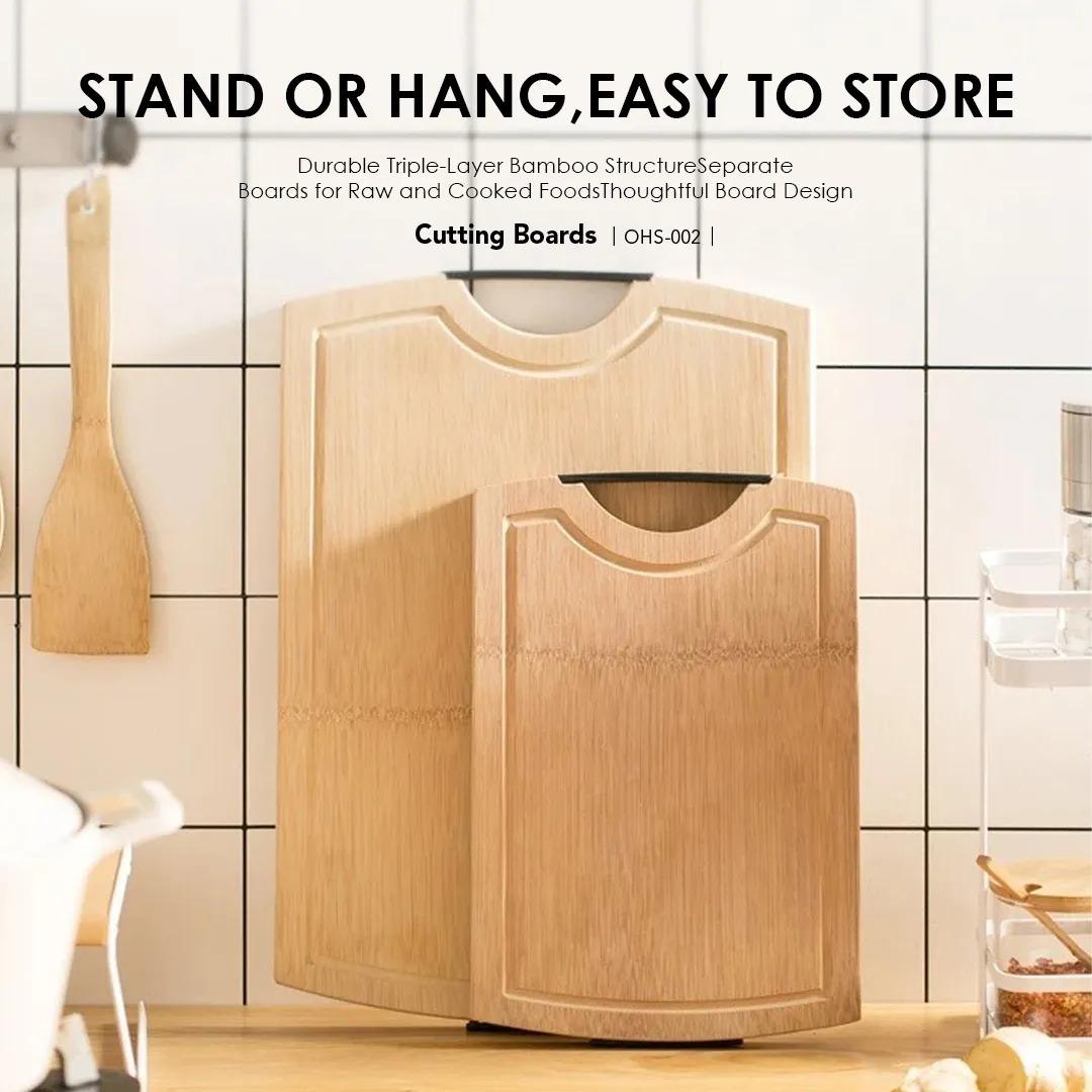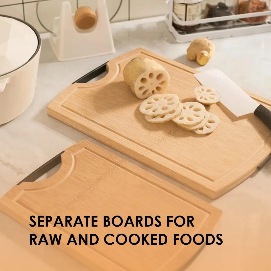 This bamboo cutting board set includes large and small boards used separately,allowing you to chop raw and cooked ingredients on different surfaces