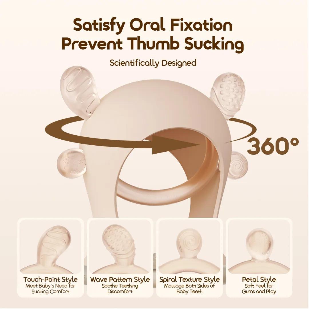 Specifically designed for teething babies, it offers four unique textures to satisfy sucking needs, ease gum pain, and gently massage growing teeth.