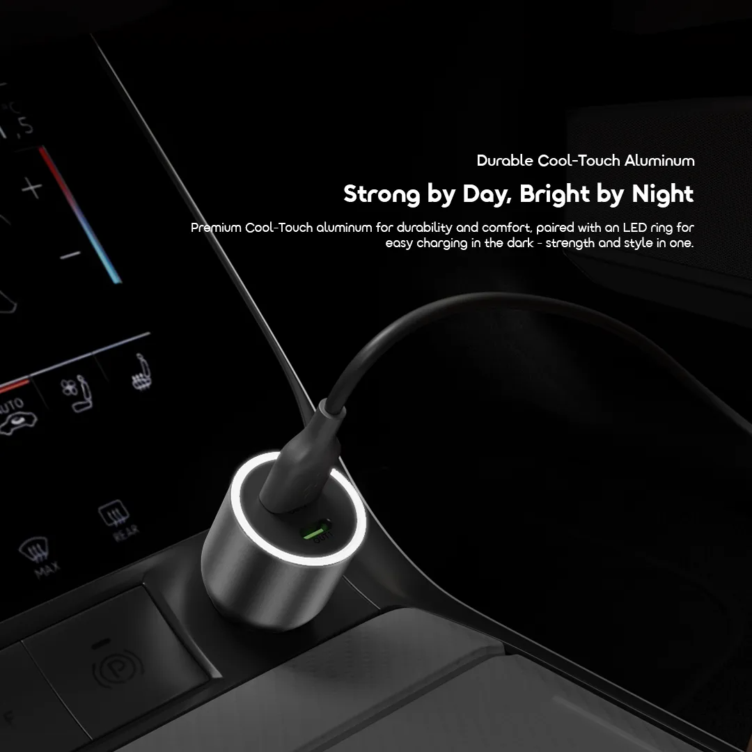 Premium Cool-Touch aluminum for durability and comfort, paired with an LED ring for easy charging in the dark - strength and style in one.